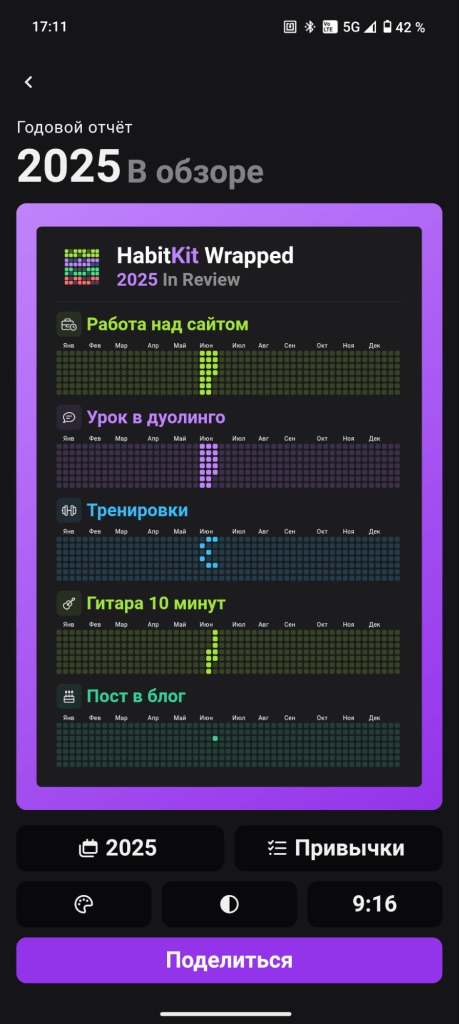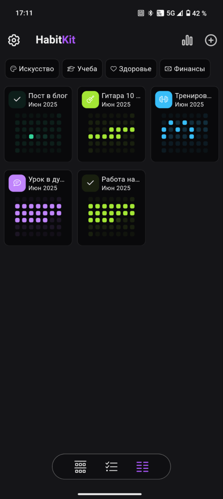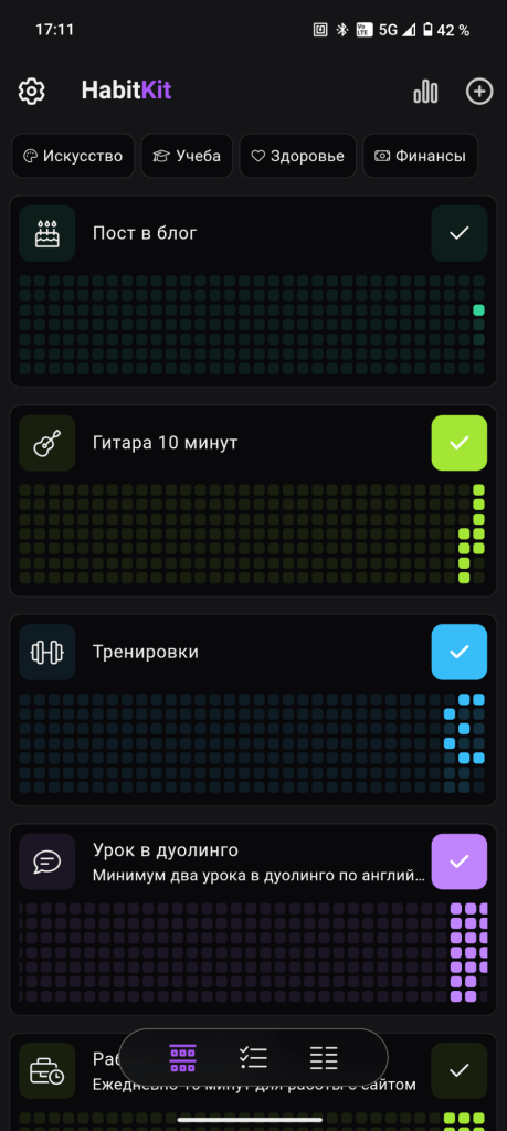 Я не хочу написать статью за один присест, выжав из себя всю энергию. Я делаю это мимоходом, но – каждый день. Есть много приложений, которые помогают отслеживать такие занятия: мне понравился HabitKit. Я перепробовал несколько и пришёл к выводу, что много функций не нужно: главное отчётность.